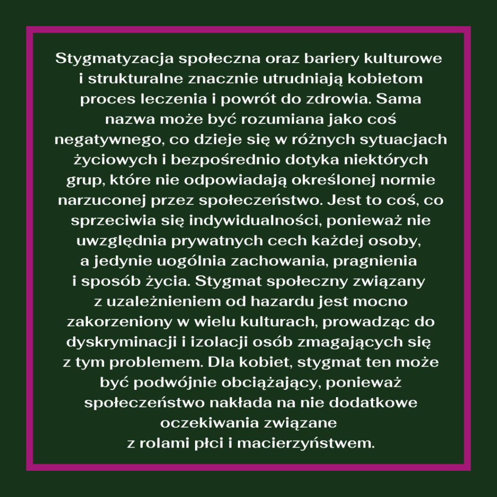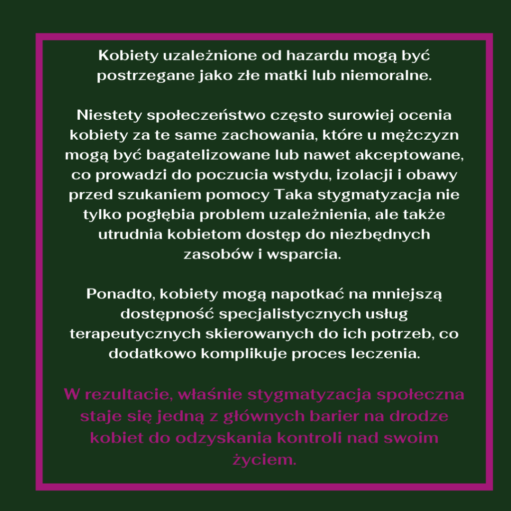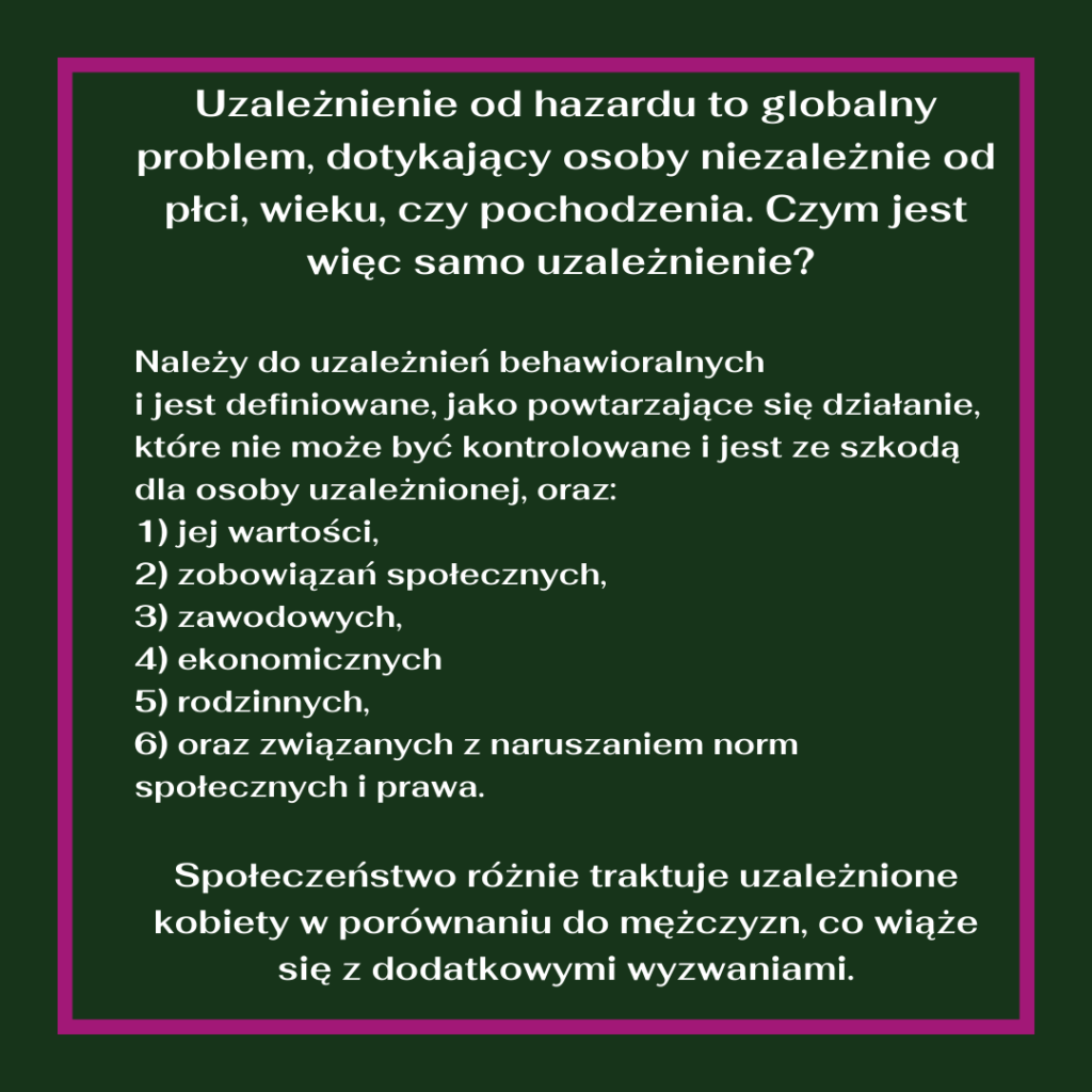 z jakimi borykają się kobiety w kontekście hazardu. Chcieliśmy zwrócić uwagę na to, jak uzależnienie może wpływać na kobiety jako osoby uzależnione, ale także jako partnerki i matki, które często mierzą się z konsekwencjami finansowymi, emocjonalnymi i społecznymi uzależnienia swoich bliskich.