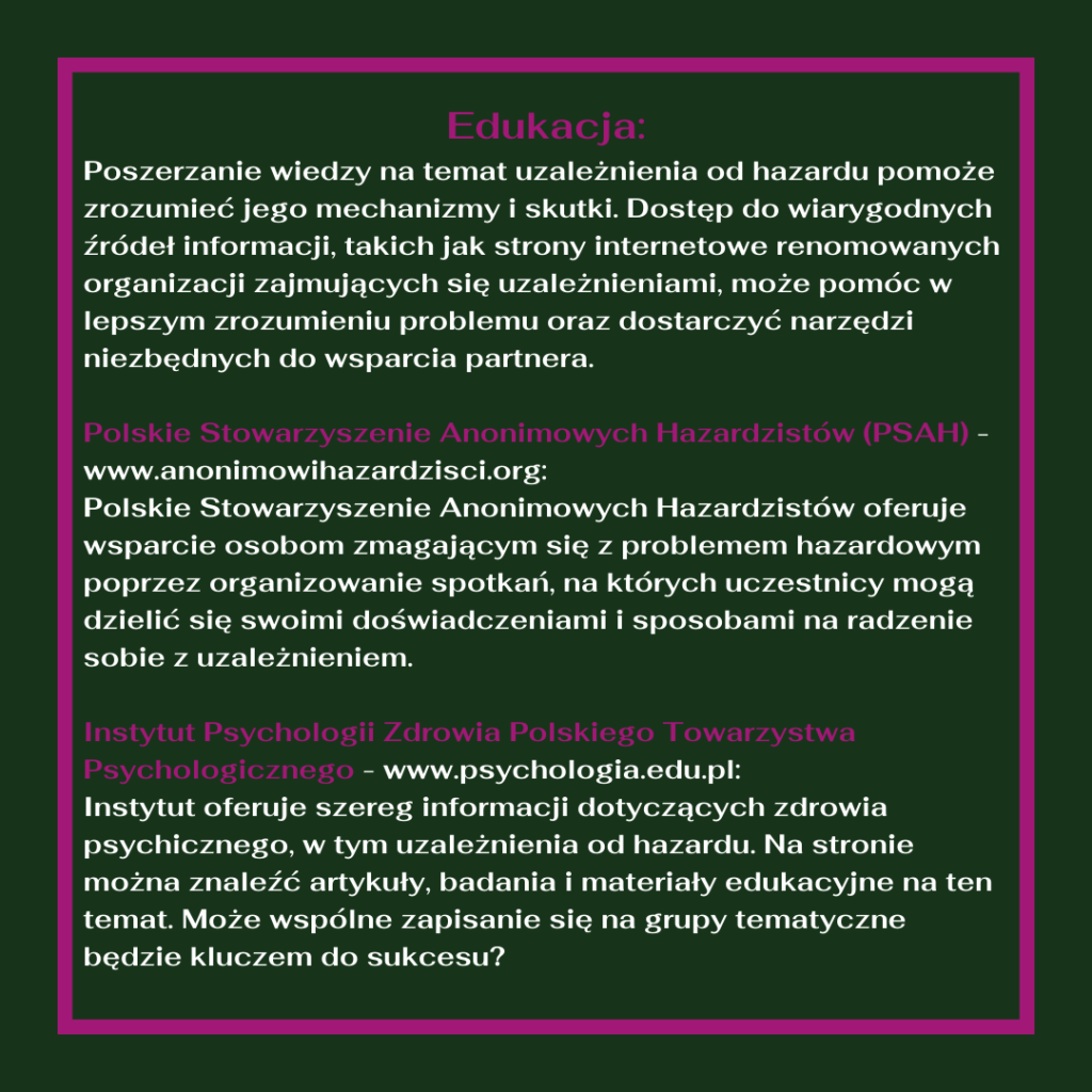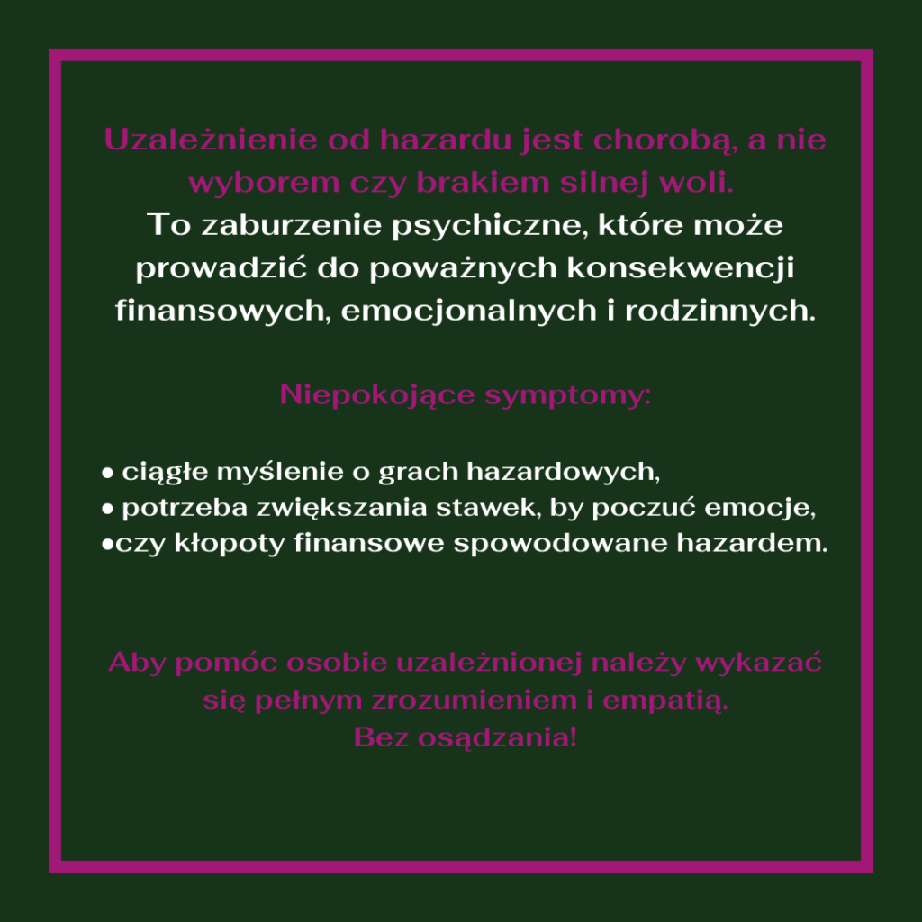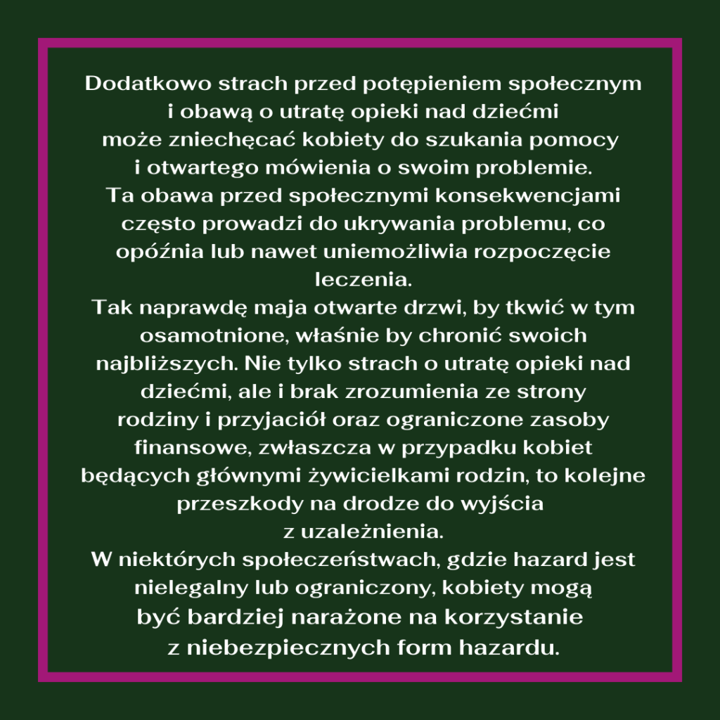 z jakimi borykają się kobiety w kontekście hazardu. Chcieliśmy zwrócić uwagę na to, jak uzależnienie może wpływać na kobiety jako osoby uzależnione, ale także jako partnerki i matki, które często mierzą się z konsekwencjami finansowymi, emocjonalnymi i społecznymi uzależnienia swoich bliskich.